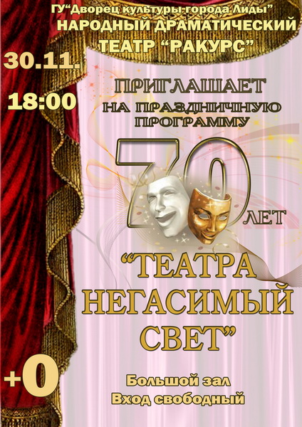 Народный драматический театр «Ракурс» Дворца культуры города Лиды отметит 70-летие творческой деятельности. По этому случаю в следующую пятницу, 30 ноября, состоится праздничная программа «Театра негасимый свет». Начало в 18:00. Вход свободный. Зрители совершат экскурс в историю, познакомятся с самыми яркими достижениями и постановками народного театра.