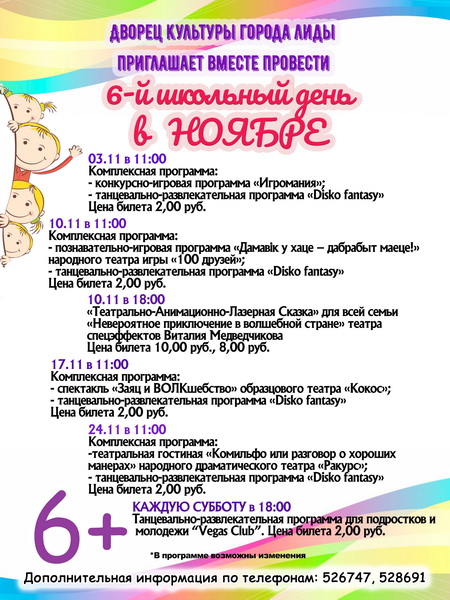 Дворец культуры города Лиды в ноябре организует мероприятия в рамках 6-го школьного дня. Ребята могут принять участие в интересных спектаклях, познавательно-игровых и танцевально-развлекательных программах. Так, 24 ноября состоится театральная гостиная народного драматического театра «Ракурс» и танцевально-развлекательная программа. Начало в 11 часов.