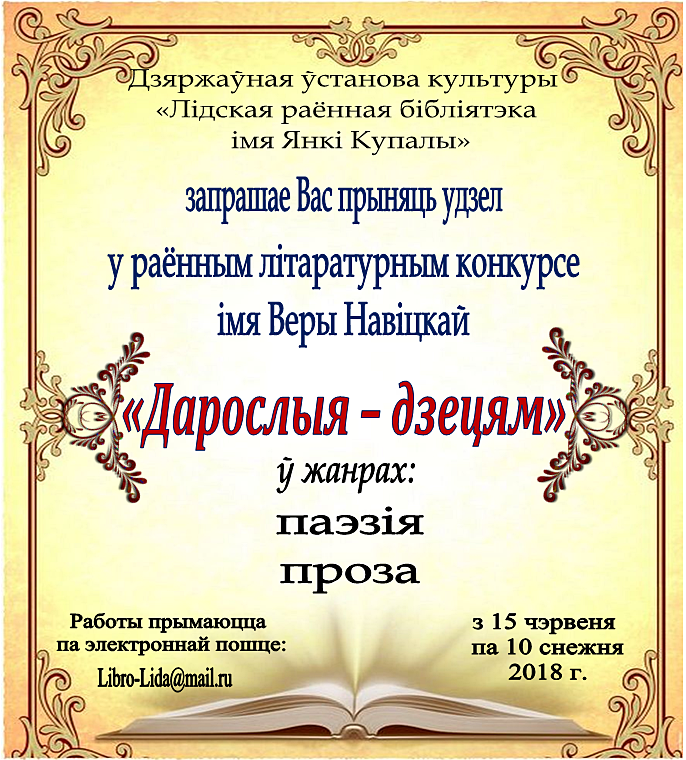 На Лидчине проходит районный литературный конкурс имени Веры Новицкой «Взрослые – детям». К участию допускаются художественные произведения традиционной формы, написанные на русском или белорусском языках. Их необходимо представить в Лидскую районную центральную библиотеку имени Янки Купалы. Победители конкурса будут определены в двух номинациях: «Поэзия» и «Проза». Подведение итогов пройдет в декабре.